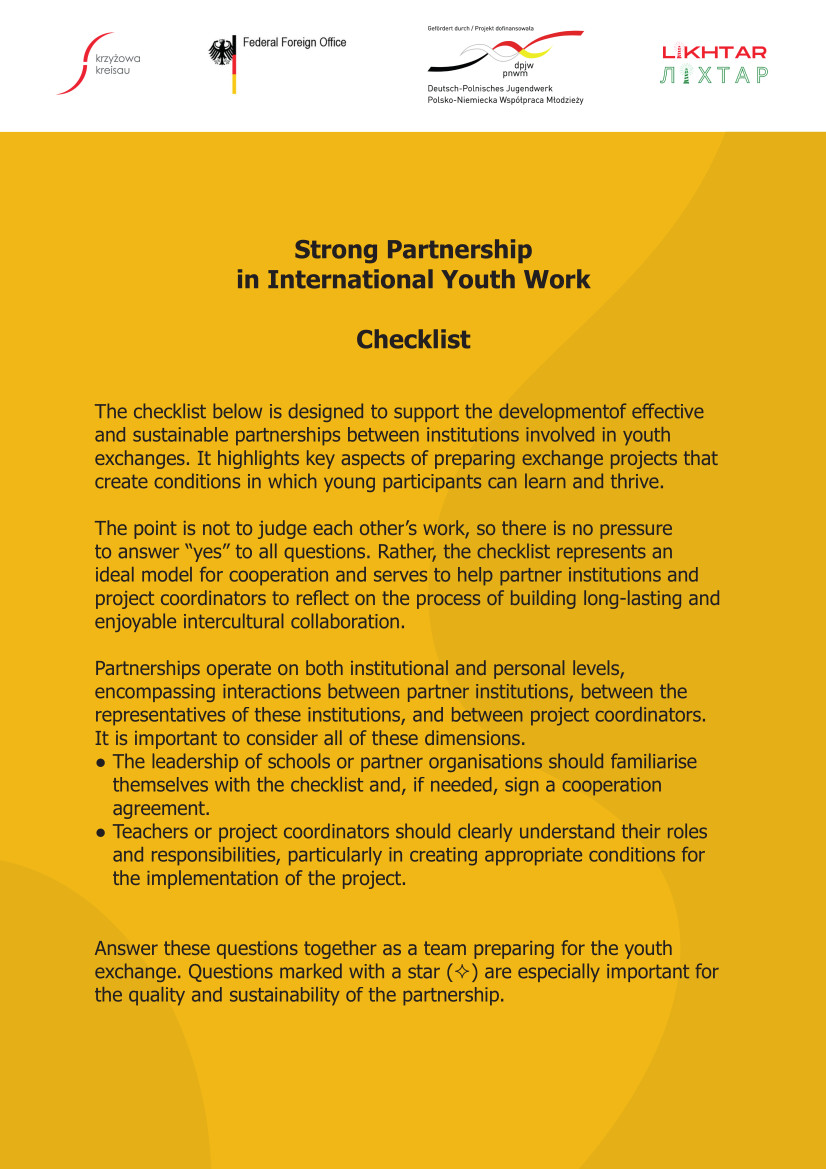 Die Checkliste entstand im Rahmen des Projekts LIKHTAR, das vom Deutsch-Polnischen Jugendwerk gefördert wurde, und wird derzeit im Rahmen der Initiative „Sustainable Partnership Project“, organisiert von der Stiftung Kreisau für Europäische Verständigung, weiterentwickelt.