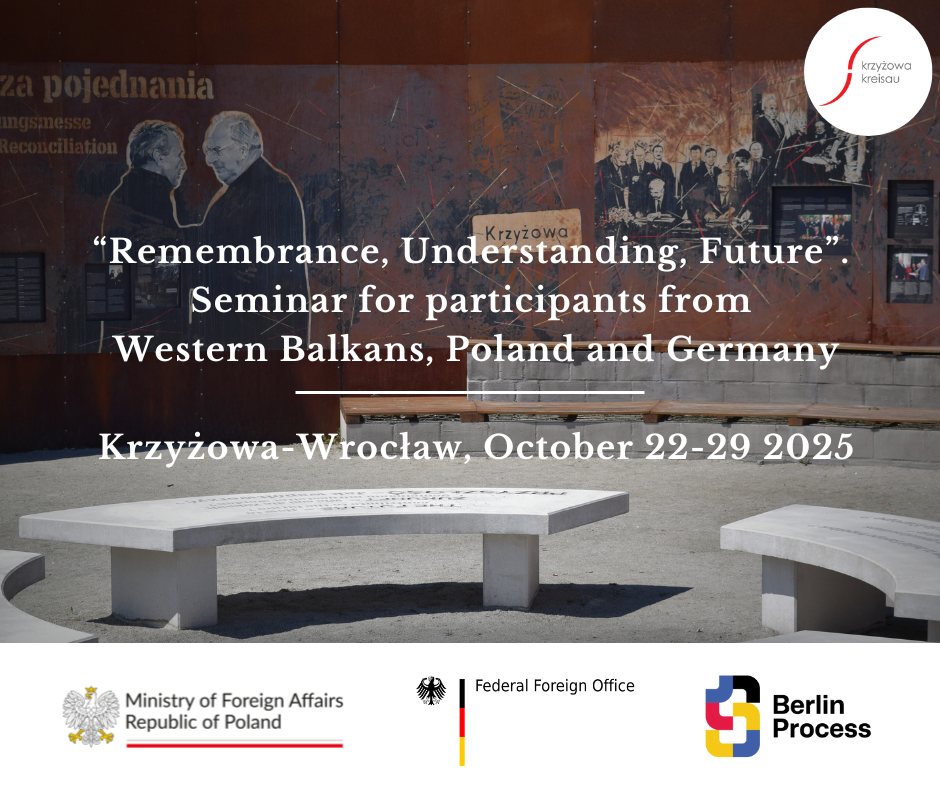 22 października 2025 roku w Krzyżowej i we Wrocławiu rozpoczyna się siedmiodniowe seminarium „Remembrance, Understanding, Future”, adresowane do młodych ludzi z dziesięciu krajów: Albanii, Bośni i Hercegowiny, Bułgarii, Chorwacji, Czarnogóry, Kosowa, Macedonii Północnej, Serbii, Polski oraz Niemiec.